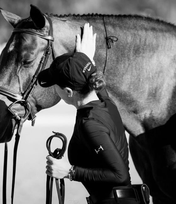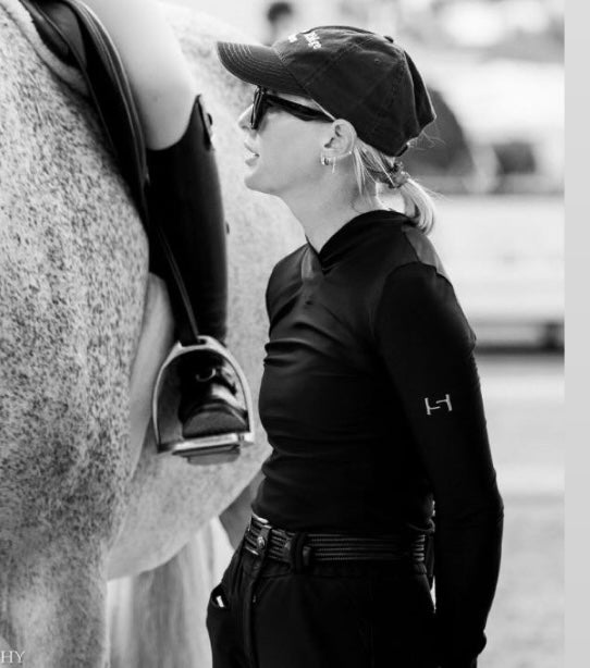 Elevated Standard Performance Fabric Top in sleek black with signature embroidered logo. Four-way stretch and breathable fabric keep you comfortable in the saddle, while the Semi Mock V-Neck Collar with functional snaps delivers a polished look. Perfect for schooling, competing, or everyday riding.